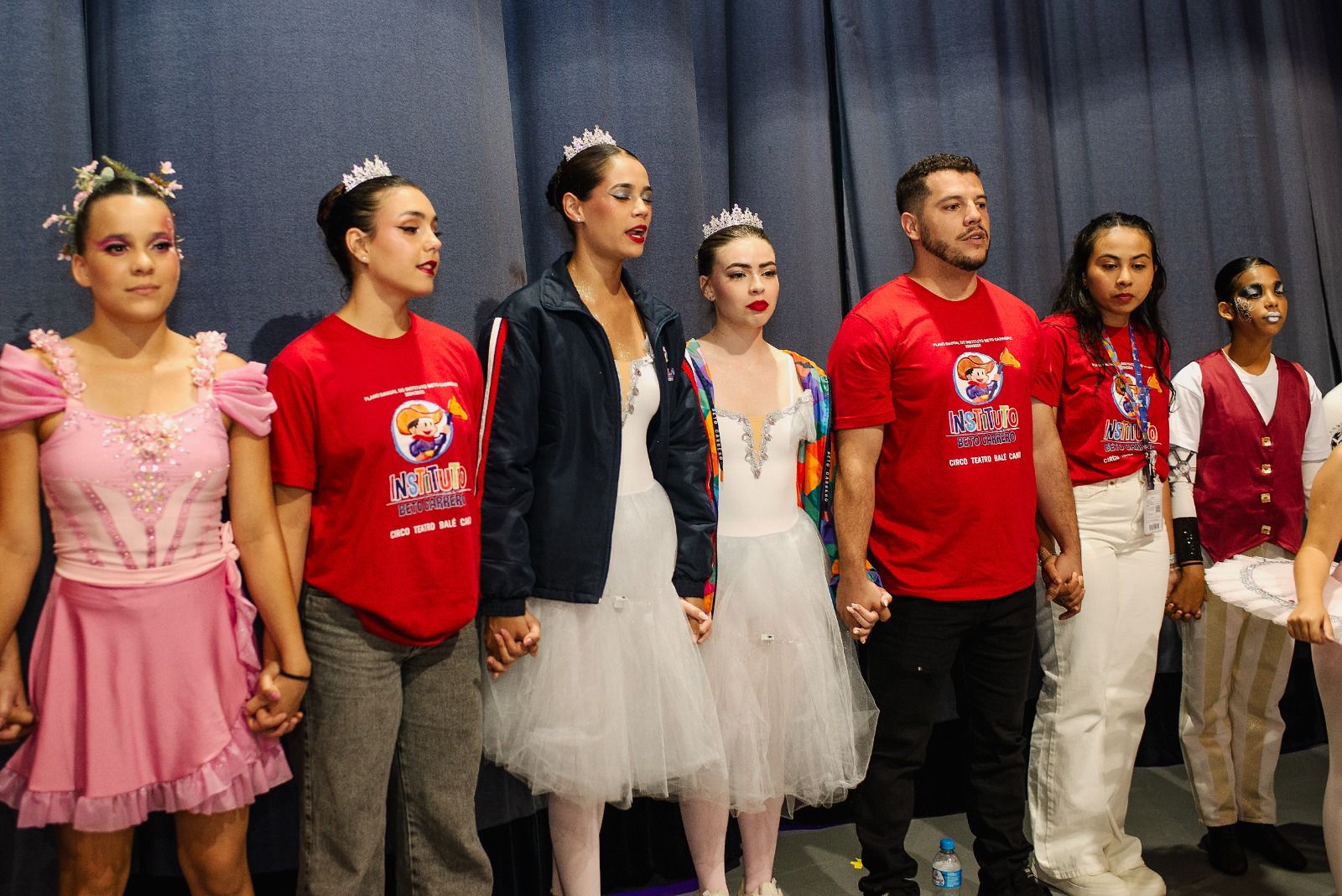 Na Oficina do Circo Escola, esse trabalho ganhou forma pelas mãos atentas de Liudmila, Lincon e Artur, que acompanharam os alunos com precisão, segurança e constante incentivo à superação. Na oficina de teatro, Rafael orientou os atores na construção cênica e na expressão emocional, dando voz e presença a cada personagem. No balé, Aline trouxe leveza, disciplina e sensibilidade, transformando cada movimento em poesia no palco. Já na oficina de canto, Júlia trabalhou a técnica vocal e a interpretação, auxiliando os alunos a encontrar sua própria voz e a emocionar o público em cada nota.